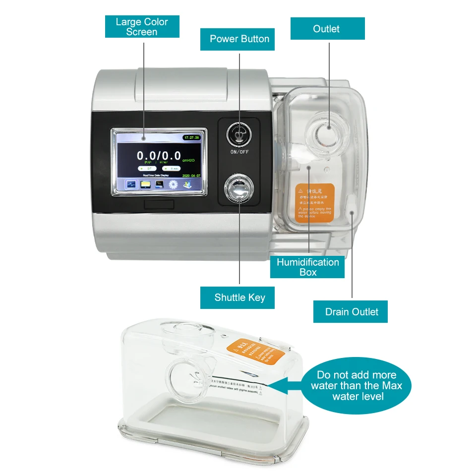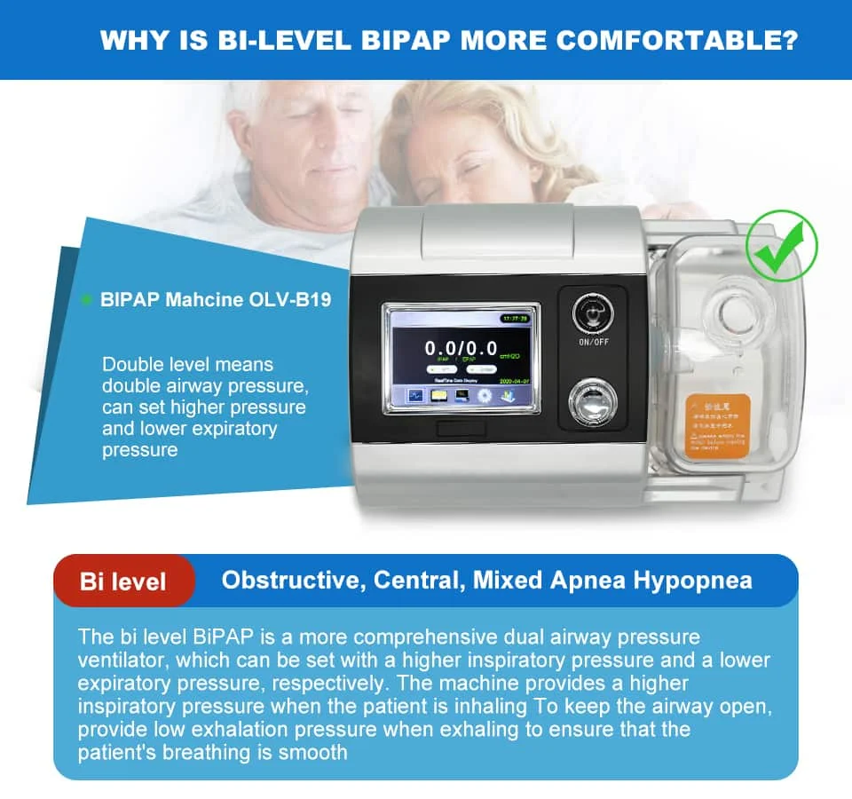 Double level means double airway pressure, can set higher pressure and lower expiratory pressure,The bi level BiPAP is a more comprehensive dual airway pressure ventilator, which can be set with a higher inspiratory pressure and a lower expiratory pressure, respectively. The machine provides a higher inspiratory pressure when the patient is inhaling To keep the airway open, provide low exhalation pressure when exhaling to ensure that the patient's breathing is smooth